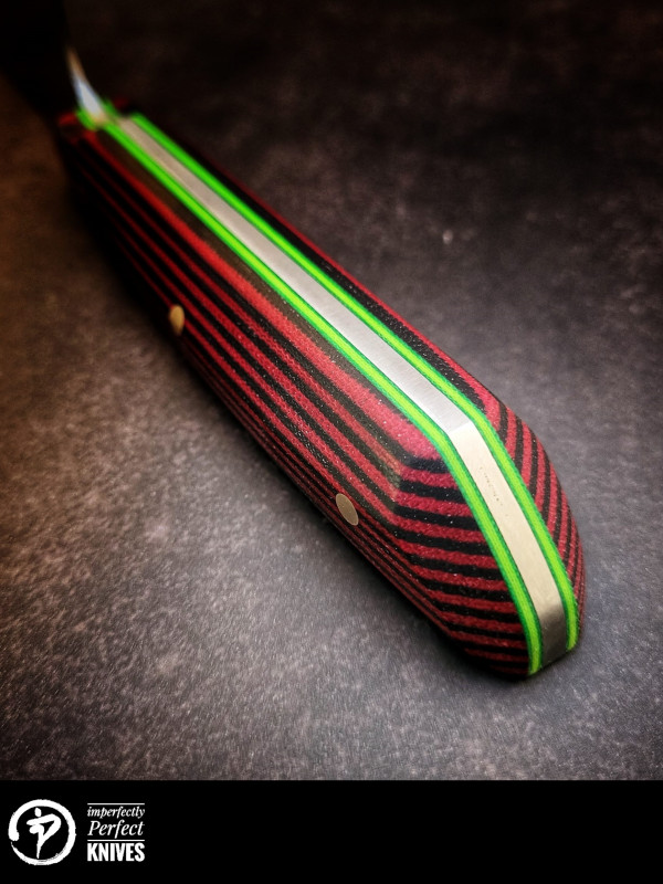 Het handvat is een full canvas 'Bourbon Nights' micarta met messing pins! Het staal ontwikkelt een waanzinnig mooie patina!